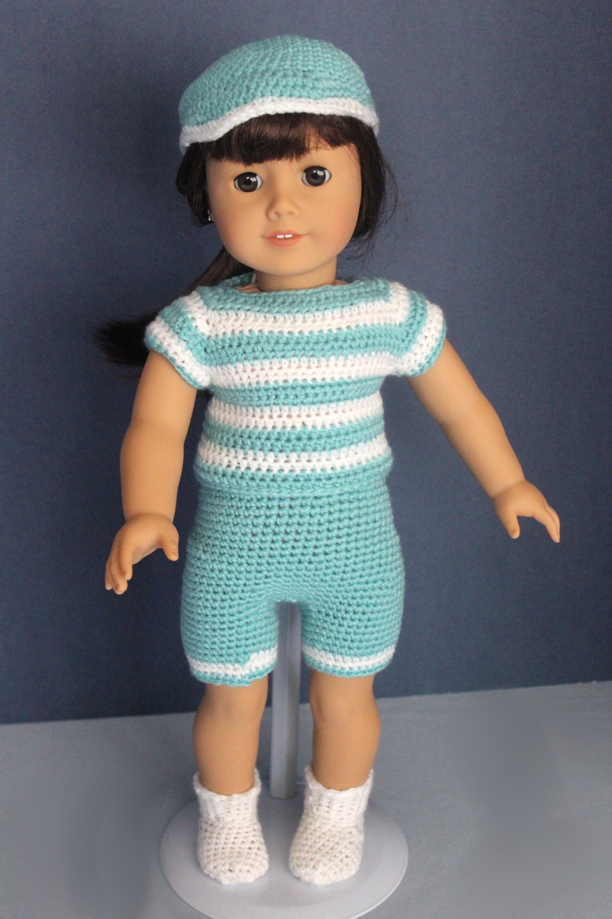 of white and light teal. Included is a pair of shorts; matching striped top with three snaps for the back closure; a pair of socks and a hat. The clothes are washable; however, I recommend hand-washing in warm water and laying flat to dry. Note: Purchase does NOT include pictured doll or doll stand. All our items are made and stored in a smoke-free environment. We ship all items U.S. Priority Mail with insurance and tracking. If you purchase multiple items, please email us PRIOR to placing your order so we can pass along any shipping savings. |