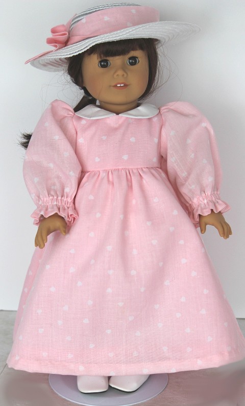 | Your 18 inch doll will look "pretty in pink" when she wears this poly/cotton dress with small white