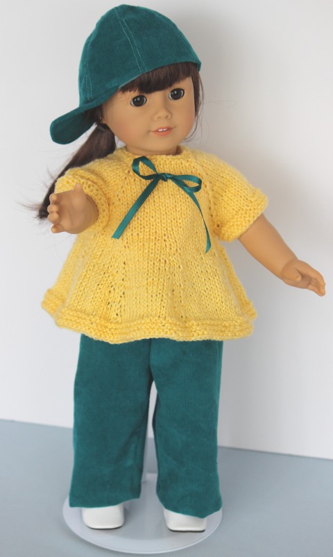 | The perfect play date outfit for your 18 inch doll. The turquoise pants and matching hat are sewn using pinwale corduroy; a very narrow wale that has the appearance of velveteen. The material is washable and has been prewashed to prevent any shrinkage. All seams are serged to prevent unraveling; the pants hem is hand-sewn and the cap has been lined. The elastic waistband makes for easy dressing. The hand-knit sweater is made using a sport weight acrylic; it has three small flower buttons for a back opening. There is a matching ribbon bow that can easily be removed before washing. The sweater is washable in cool water; I recommend hand washing or enclosed in a lingerie bag and washing on delicate. Note: Purchase does NOT the doll, doll stand and doll shoes. All our items are made and stored in a smoke-free environment. We ship all items U.S. Priority Mail with insurance and tracking. If you purchase multiple items, please email us PRIOR to placing your order so we can pass along any shipping savings. |