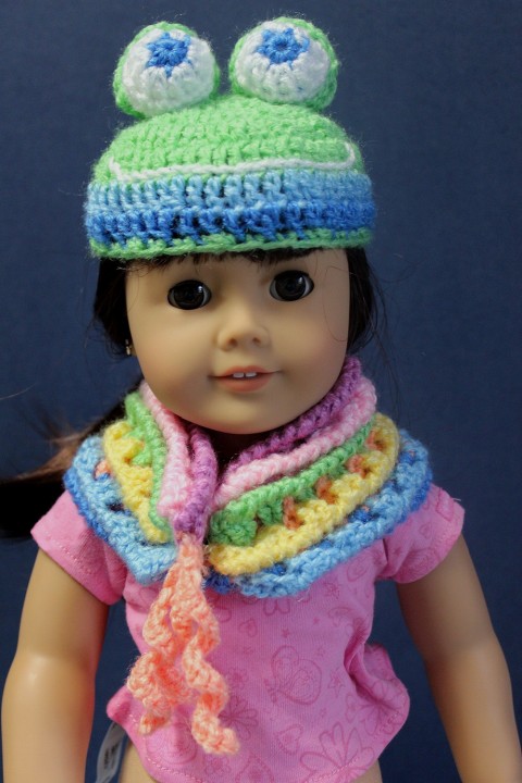 | Hand-crocheted Frog Hat and matching cowl for 18 inch doll 2 ways to purchase Pay by Paypal or credit card either way! |