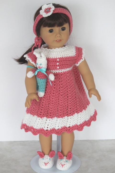 | The adorable sleepwear outfit and toy bunny for the 18 inch doll which has been completely hand-crocheted