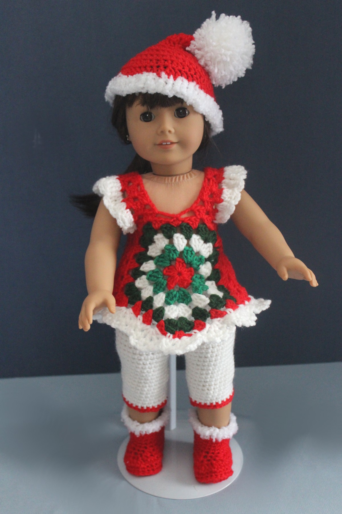 is sure to delight any collector of the 18 inch dolls. Please note: The doll and doll stand ARE NOT included in this sale! Outfit includes a granny square topper that ties in the back, matching pants, hat and boots. Yarn used is Herrschners Sport Weight in colors of red, green & white. The pattern is an orignal design of Annie Potter and hand-crocheted by Cathy of SNS Hooks and Needles. All yarns used to make the outfit are washable; however, I recommend hand-washing in cool water and laying flat to dry. Note: Purchase does NOT include pictured doll or doll stand. All our items are made and stored in a smoke-free environment. We ship all items U.S. Priority Mail with insurance and tracking. If you purchase multiple items, please email us PRIOR to placing your order so we can pass along any shipping savings. |