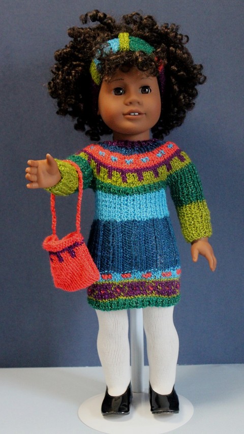 book 25 Fun, Fabulous Outfits for 18-Inch Dolls. The dress, headband and purse are knitted using Lion Brand Bonbons yarn that has a metallic thread running through it. The top of the stockings is finished with a couple of rows of crochet to give them a "finished" look.The yarn is an acrylic that is machine wash cool, lay flat to dry. However, as with all hand-knits, I would recommend hand washing. The dress back closure has three (3) snaps sewn on (see picture of back of dress) and the purse has a snap closure sewn on as well. I would not recommend this outfit for children under 7 because the knitting might get caught on the dolls fingers causing damage to the dress. This purchase is for the outfit as described only. The doll and doll stand are NOT included in the purchase of this item. |